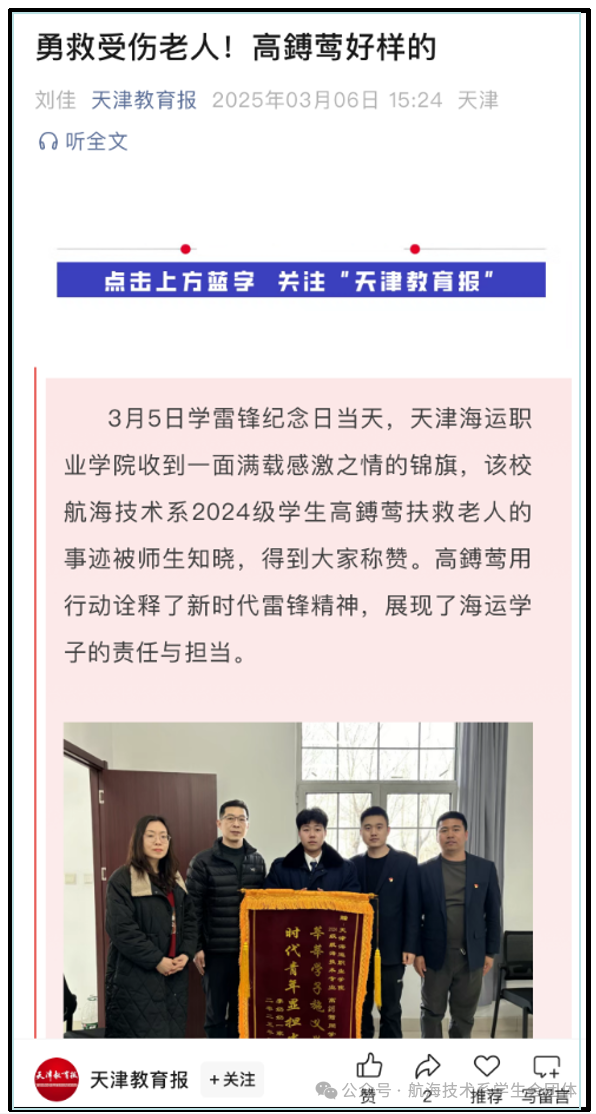 《天津教育报》公众号报道航海技术系学子高鎛莺勇救受伤老人感人事迹!