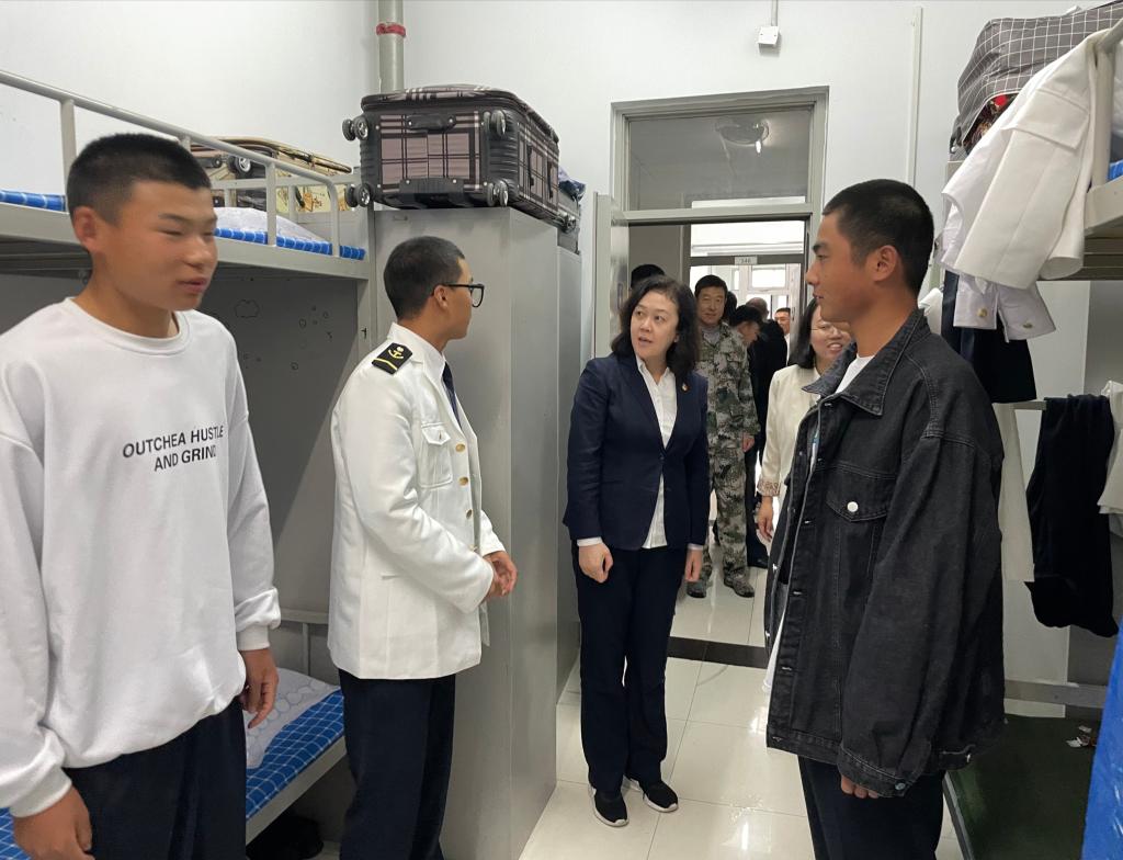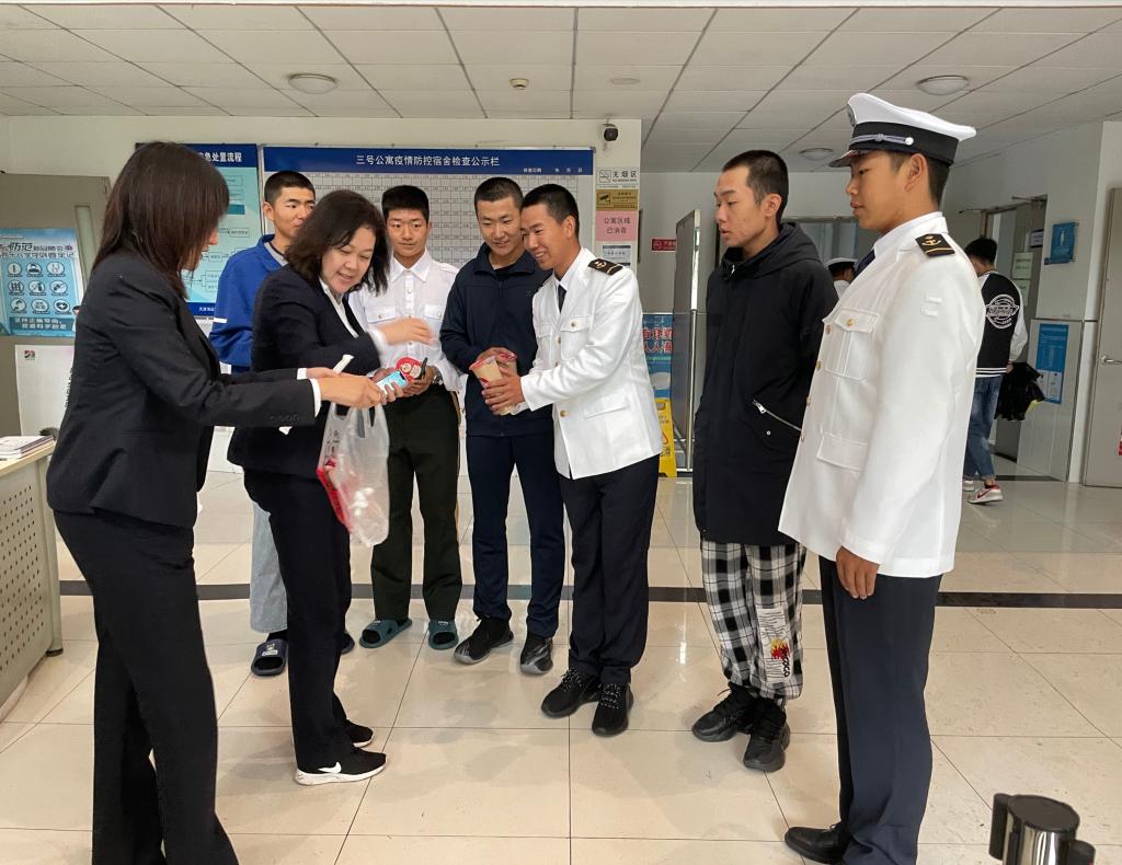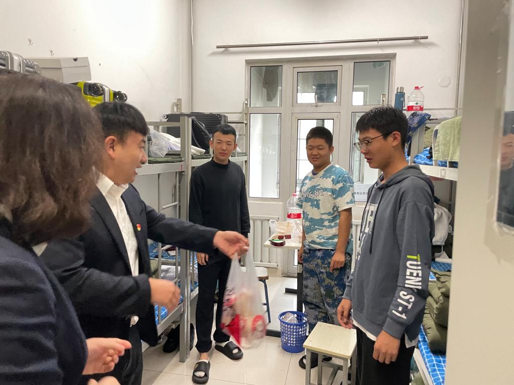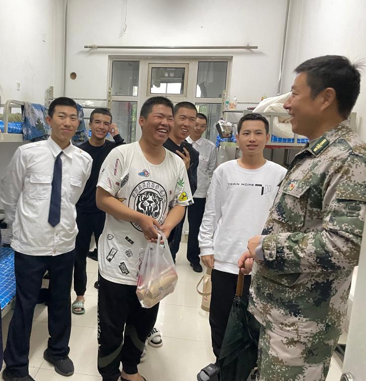 我院2021级新生开学典礼暨军训汇报表演于今日如期举行。活动结束后,航海技术系党支部书记韩凌带领全体学生管理团队到宿舍慰问冒雨坚持的同学们,辅导员们更是主动自费给同学们买奶茶。