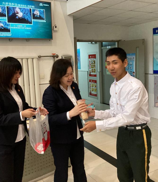 韩书记和辅导员为国旗班和特色方队的同学递去一杯杯热腾腾的奶茶,驱走寒气,嘱咐同学们及时更换干衣服,多喝热水,及时调整状态,以最好的精神面貌迎接下周的开学第一日。